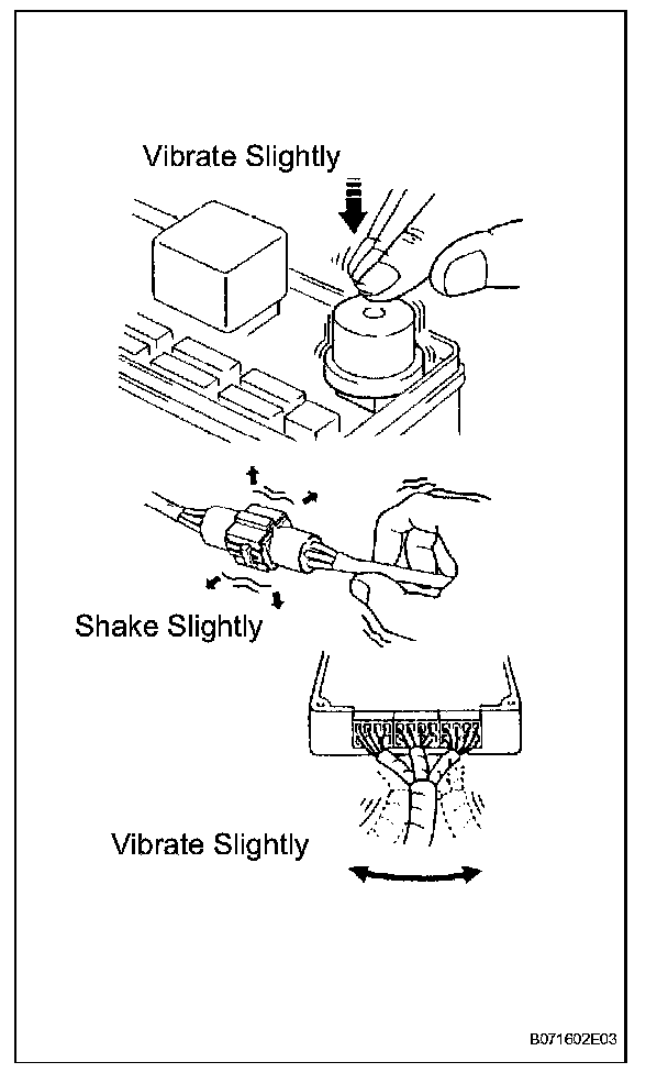 With a problem that only occurs when the engine is cold or as a result of vibration caused by the road during driving, the problem can never be determined if the symptoms are being checked on a stationary vehicle or a vehicle with a warmed-up engine. Vibration, heat or water penetration (moisture) is difficult to reproduce. The symptom simulation tests below are effective substitutes for the conditions and can be applied on a stationary vehicle. Important points in the symptom simulation test: