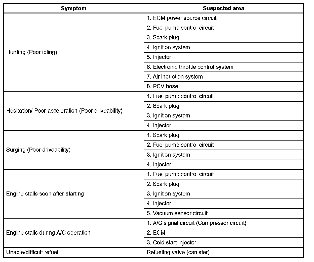 HINT: Use the table to help determine the cause of the problem. The potential cases of the symptoms are listed in order of probability in the "Suspected area" column of the table. Check each symptom by checking the suspected areas in the order they are listed. Replace parts as necessary.