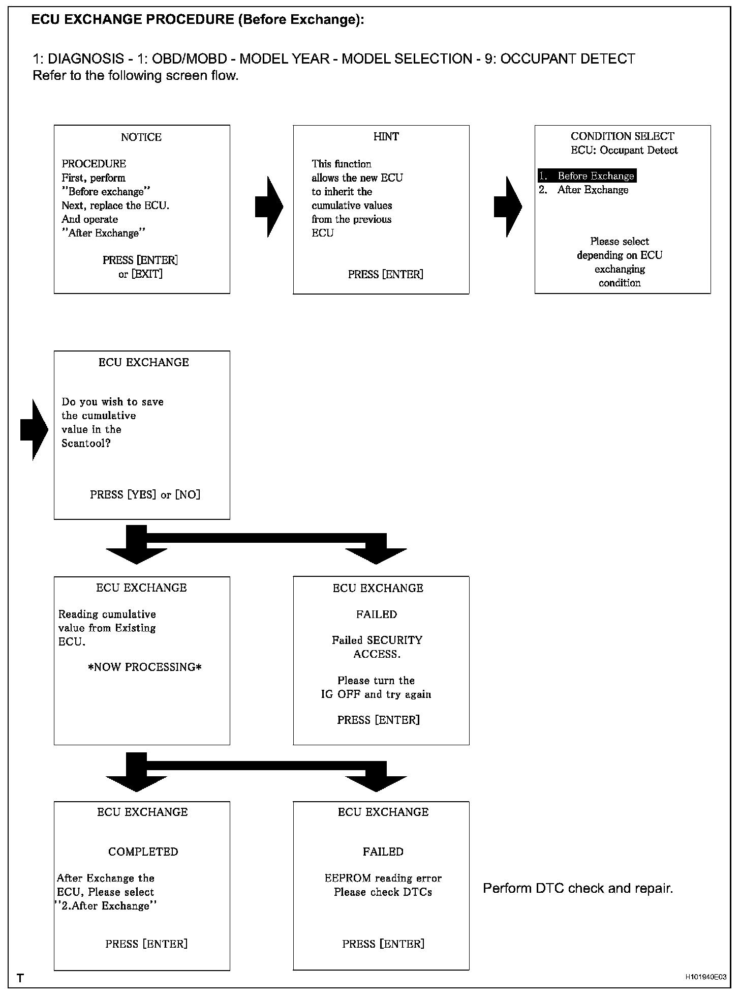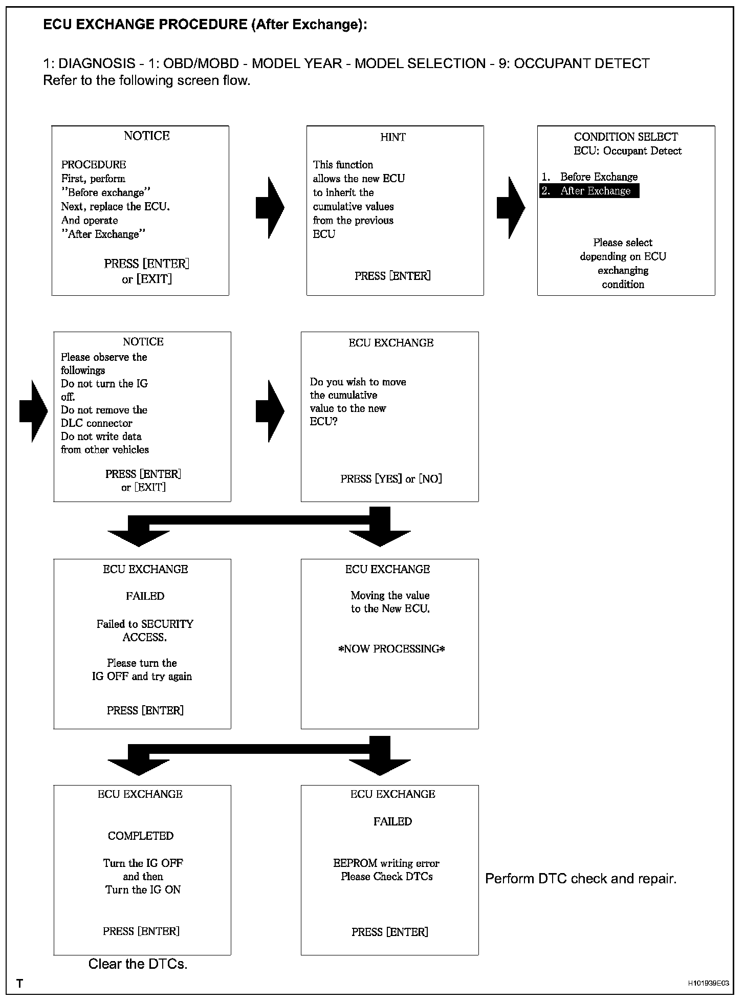 - ECU EXCHANGE procedure (Before Exchange) describes the procedure to save the data in the intelligent tester from the occupant classification ECU which has been installed on the vehicle.ECU EXCHANGE procedure (After Exchange) describes the procedure to load the data from the previous ECU, stored in the intelligent tester, into the new ECU.