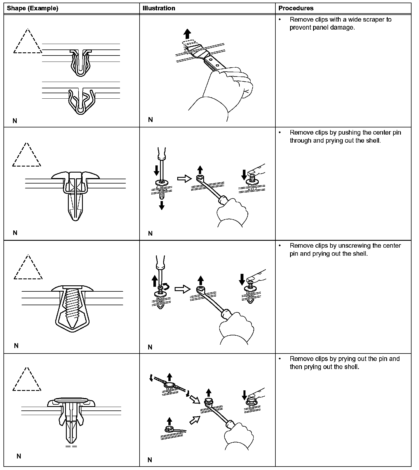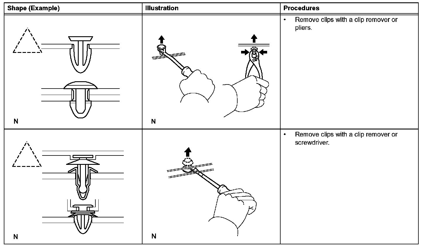 1. The removal and installation methods of typical clips used for vehicle body parts are shown in the table.