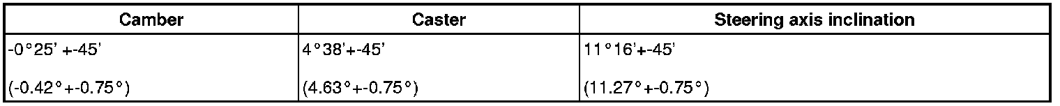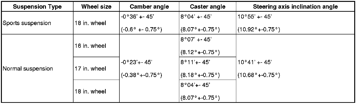 - The maximum tolerance of right and left difference for the camber and caster is 30' (0.5°) or less.