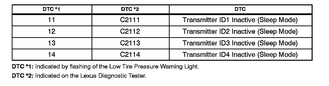 ^ The Diagnostic Trouble Codes (DTCs) listed below may be stored in the TPWS ECU until the tire pressure warning valves/sensors are activated.