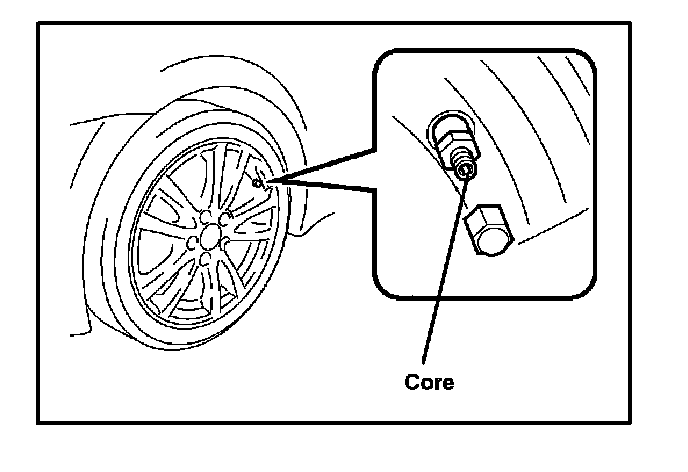 4. Press or remove the valve core to reduce the tire inflation pressure rapidly by 6 psi (0.4 kgf/sq.cm, 40 kPa), or more, within 30 seconds.