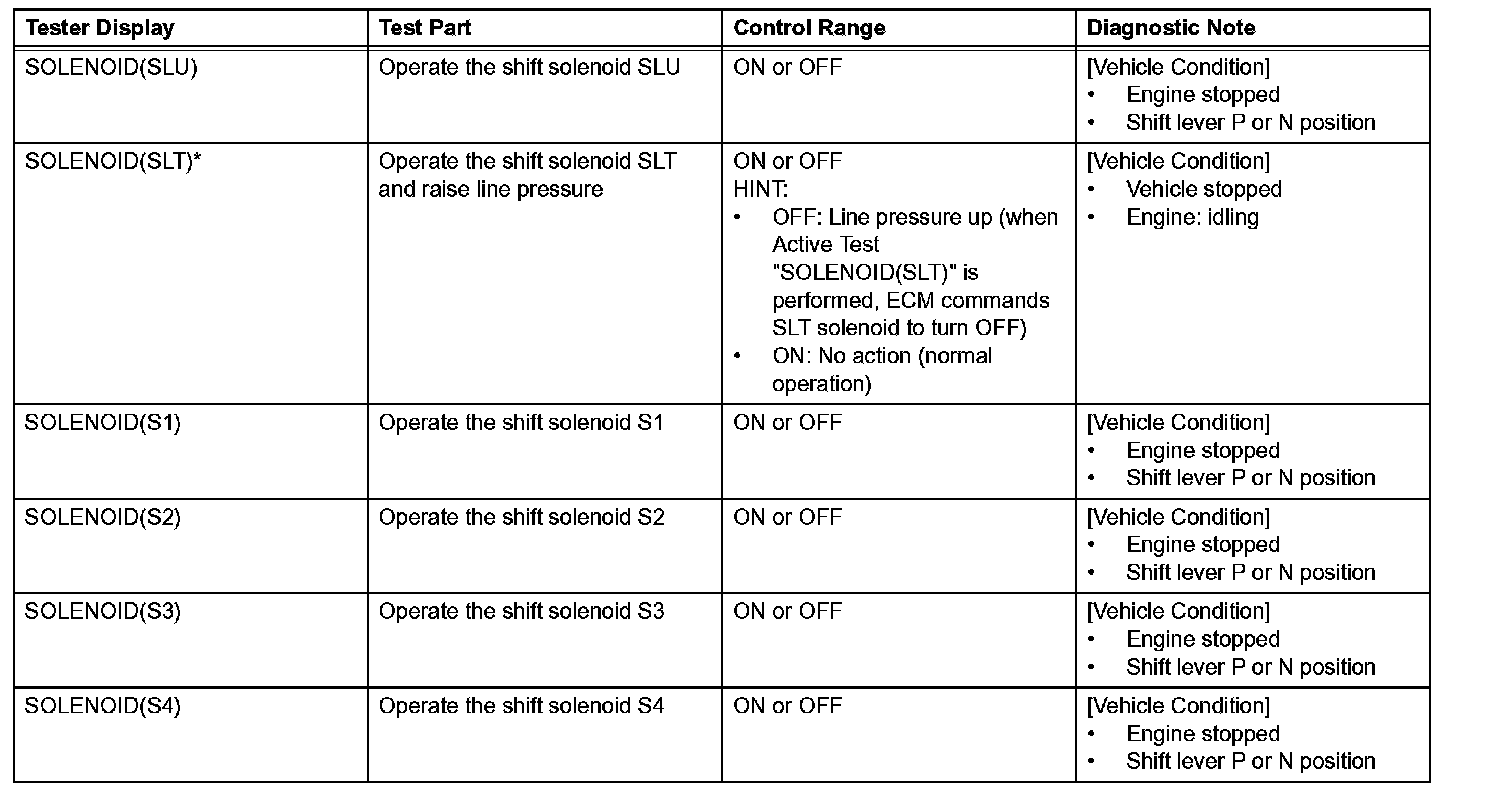 *: "SOLENOID (SLT)" in the ACTIVE TEST is performed to check the line pressure changes by connecting the SST to the automatic transmission, which is used in the HYDRAULIC TEST as well. Hydraulic Test