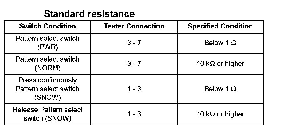 If the resistance value is not as specified, replace the pattern select switch.