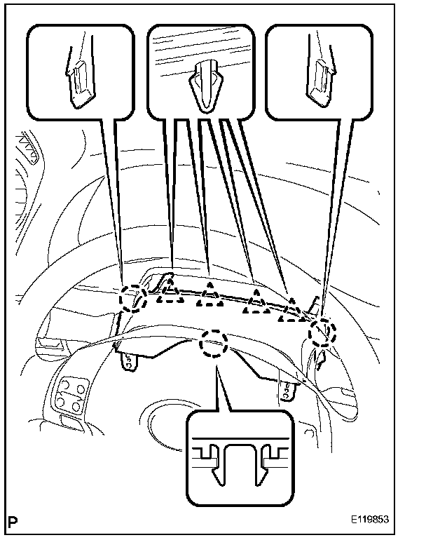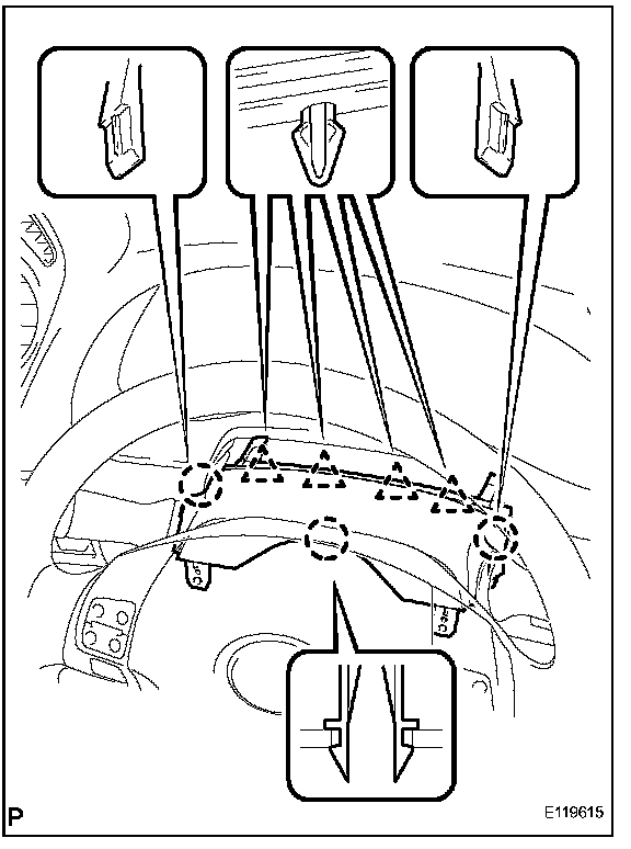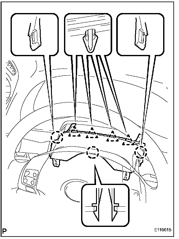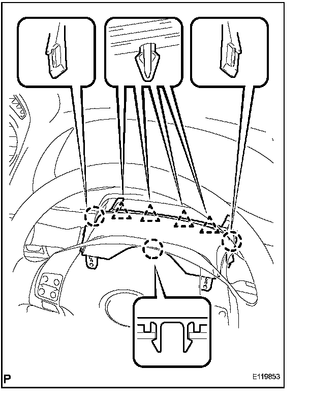 d. Disengage the 4 clips and 3 claws to remove the steering column cover upper.
