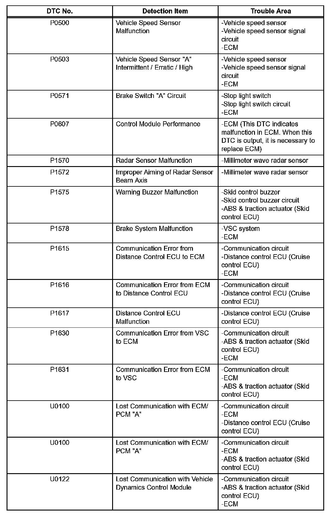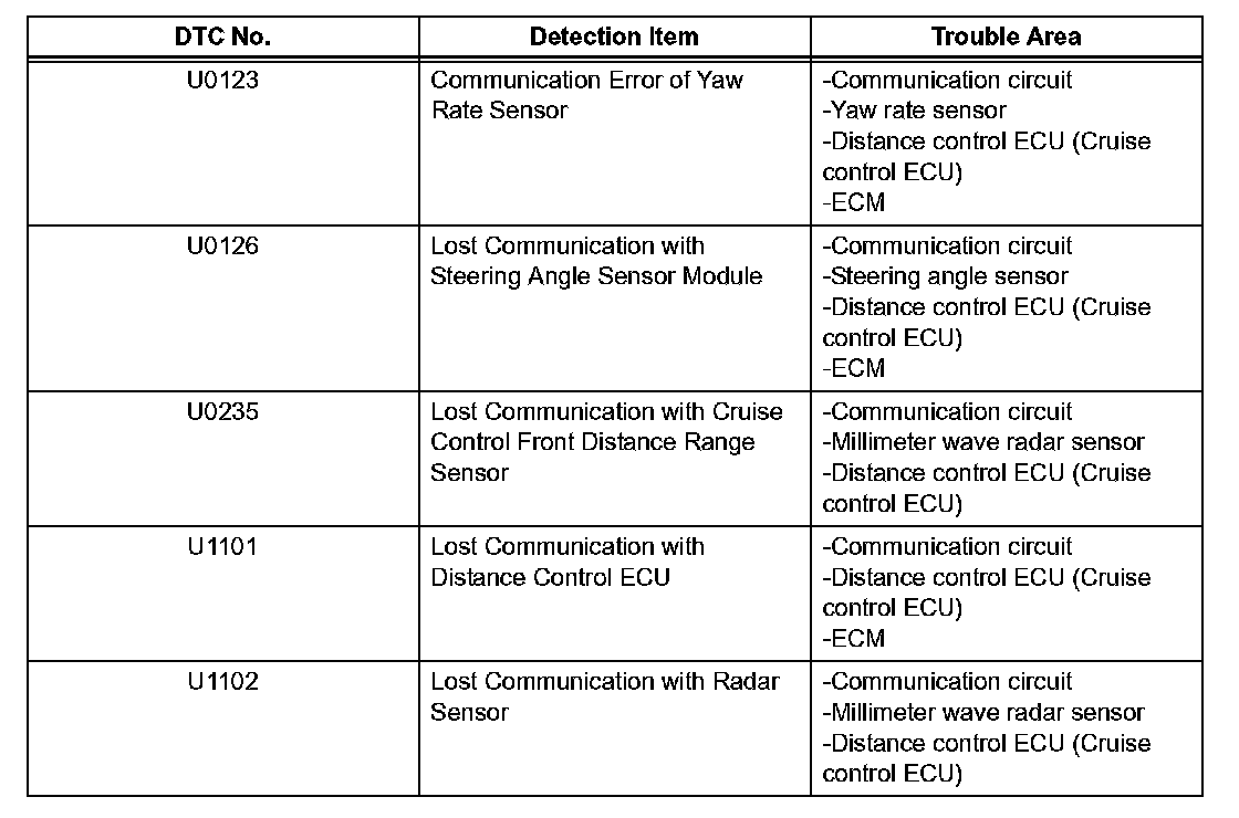 If a trouble code is displayed during the DTC check, check the trouble areas listed for that code in the table.