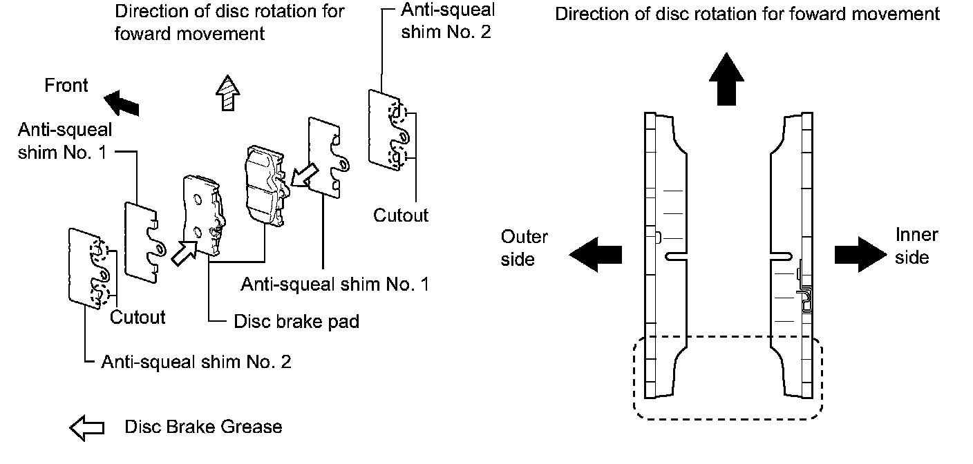 NOTICE: When replacing worn pads, the anti-squeal shims must be replaced together with the pad. Install each shim in the correct position and direction. There should be no oil or grease on the friction surfaces of the pads and the disc.