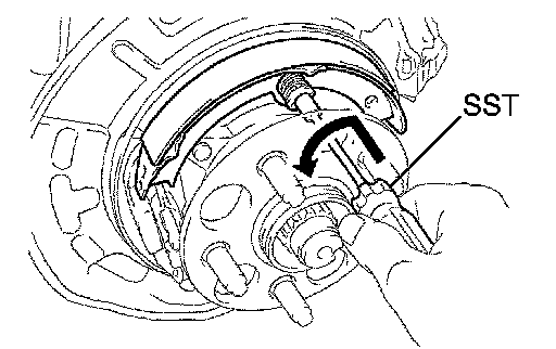 a. Using SST, install the No. 1 parking brake shoe assembly with the No. 1 shoe hold down spring cup, No. 1 compression spring and No. 1 shoe hold down spring pin.