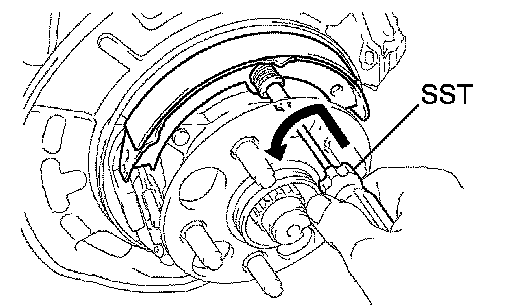 a. Using SST, install the No. 2 parking brake shoe assembly with the No. 1 shoe hold down spring cup, No. 1 compression spring and No. 1 shoe hold down spring pin.