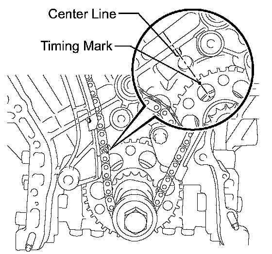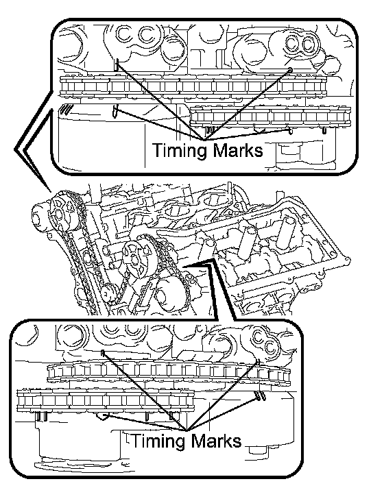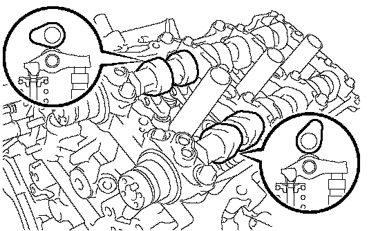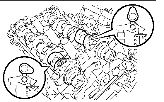c. Check that the timing marks of the camshaft timing gears are aligned with the timing marks of the bearing cap as shown in the illustration.