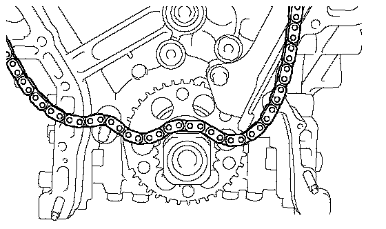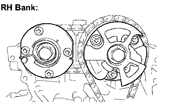 d. Turn the camshaft timing gear assembly on the RH bank clockwise (approximately 60°) and set it as shown in the illustration. Be sure to loosen the chain between the banks.