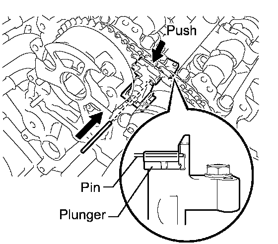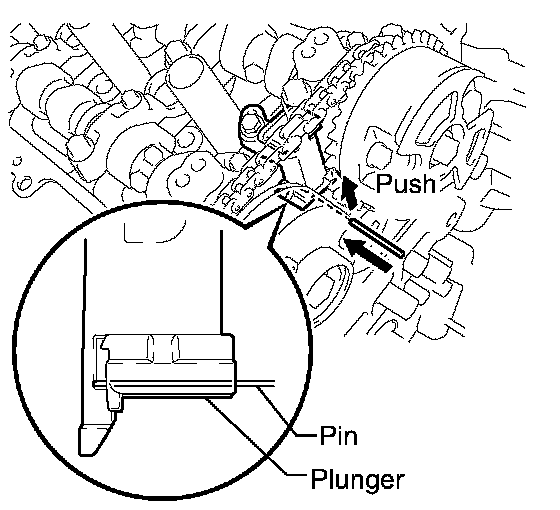 a. While pushing down the No. 3 chain tensioner, insert a pin of diameter 1.0 mm (0.039 inch) into the hole to fix the No. 3 chain tensioner.