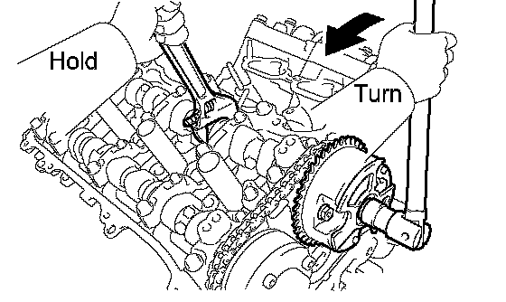 b. Hold the hexagonal portion of the camshaft with a wrench, and remove the 2 bolts and 2 camshaft timing gear assemblies.