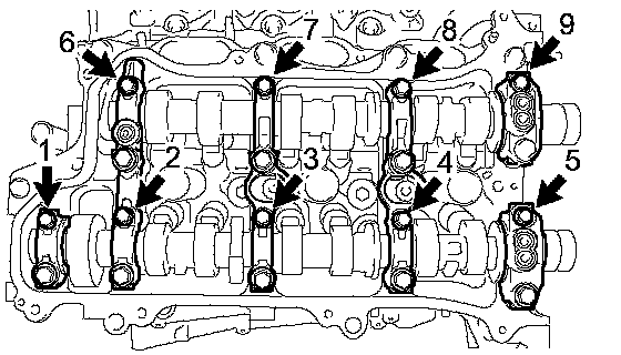 b. Uniformly loosen and remove the 9 bearing cap bolts in the sequence shown in the illustration.