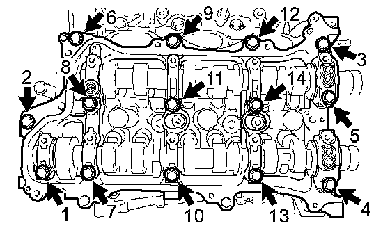 c. Uniformly loosen and remove the 14 bearing cap bolts in the sequence shown in the illustration.