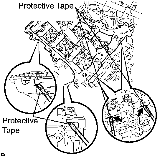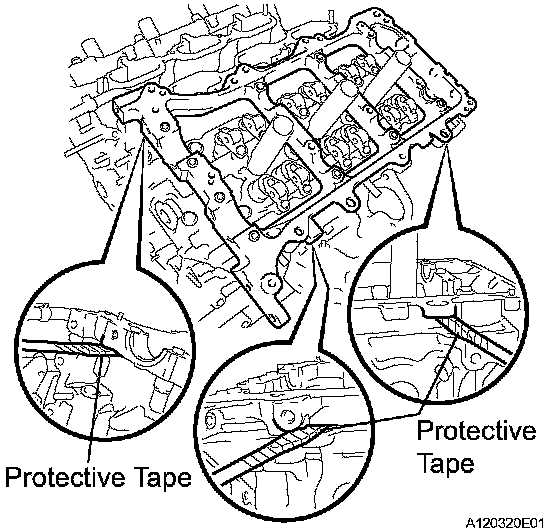 NOTICE: Be careful not to damage the contact surfaces of the cylinder head and camshaft housing.