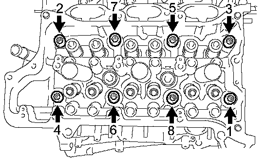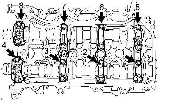 b. Uniformly loosen and remove the 8 bearing cap bolts in the sequence shown in the illustration.