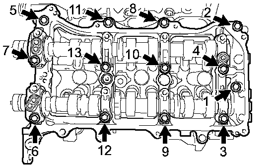 c. Uniformly loosen and remove the 13 bearing cap bolts in the sequence shown in the illustration.