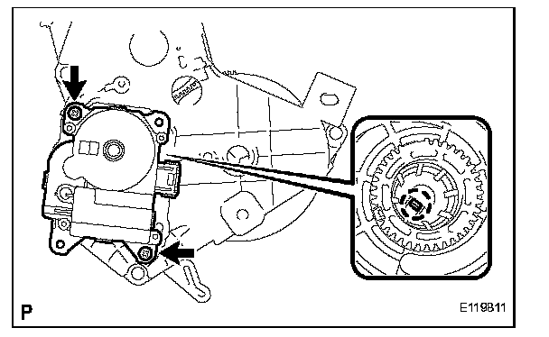 - The number of gear teeth from the standard position varies according to the stop position of the air mix control servo motor. Make sure that the gears are engaged at a point with the same number of gear teeth from the standard position.