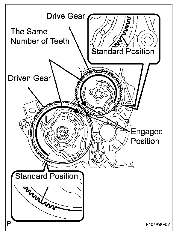 - If there is not the same number of gear teeth from the standard position on each gear at the point where the two gears are engaged, remove the drive gear, adjust the driven gear, and reinstall the drive gear.