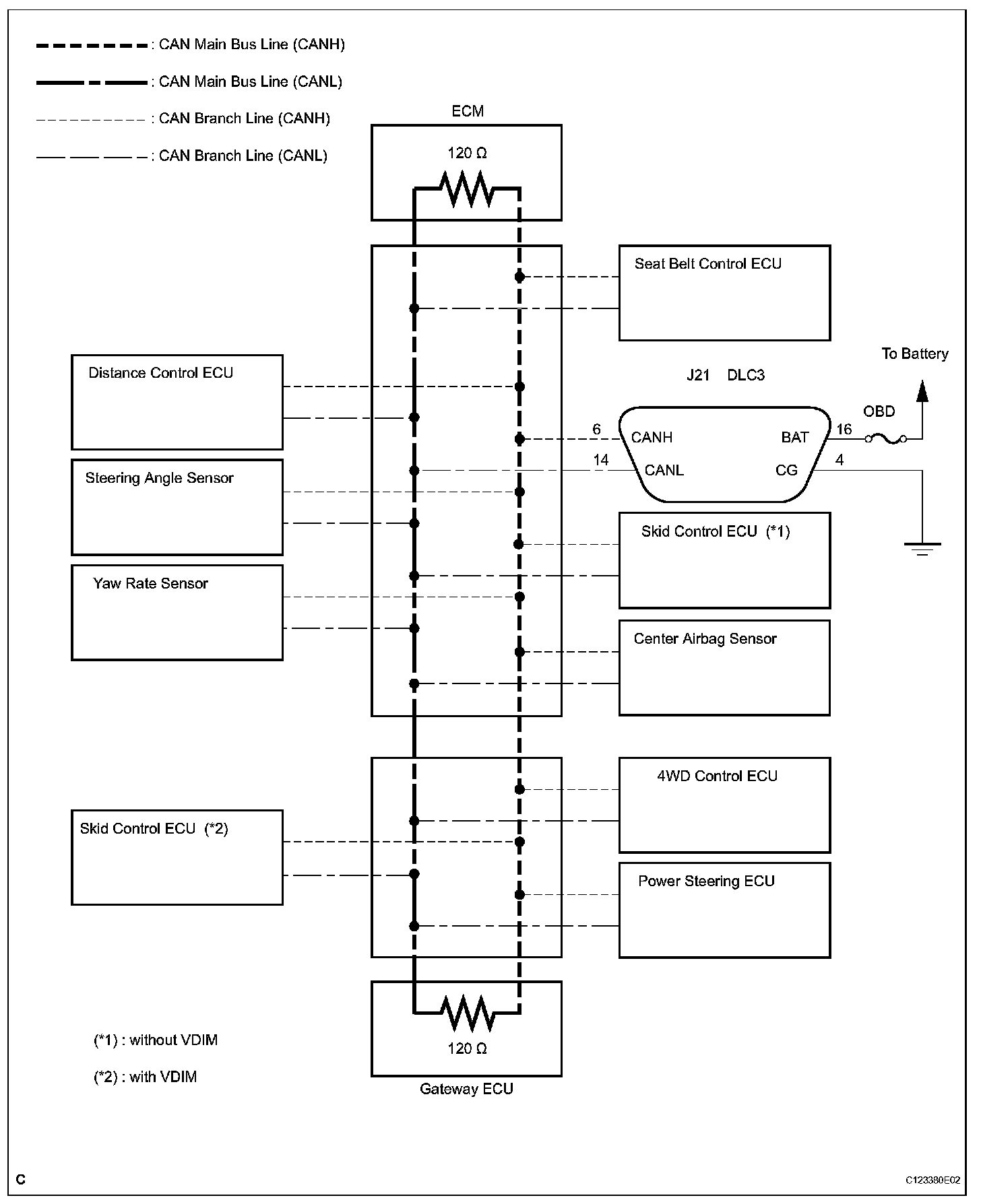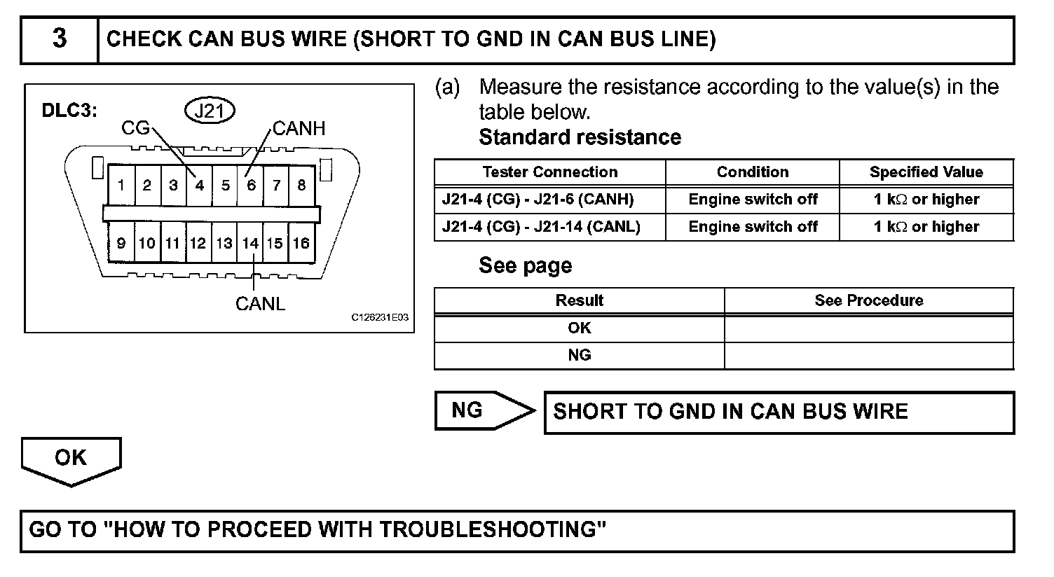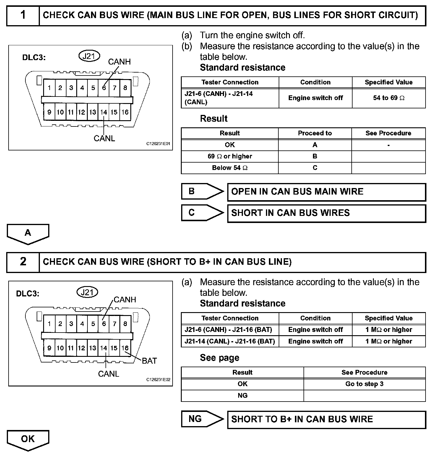 When any DTC for the CAN communication system is output, first measure the resistance between the terminals of the DLC3 to specify the trouble area. Then check that there is no short in the CAN main bus line, between the CAN bus lines, to +B, or to GND.