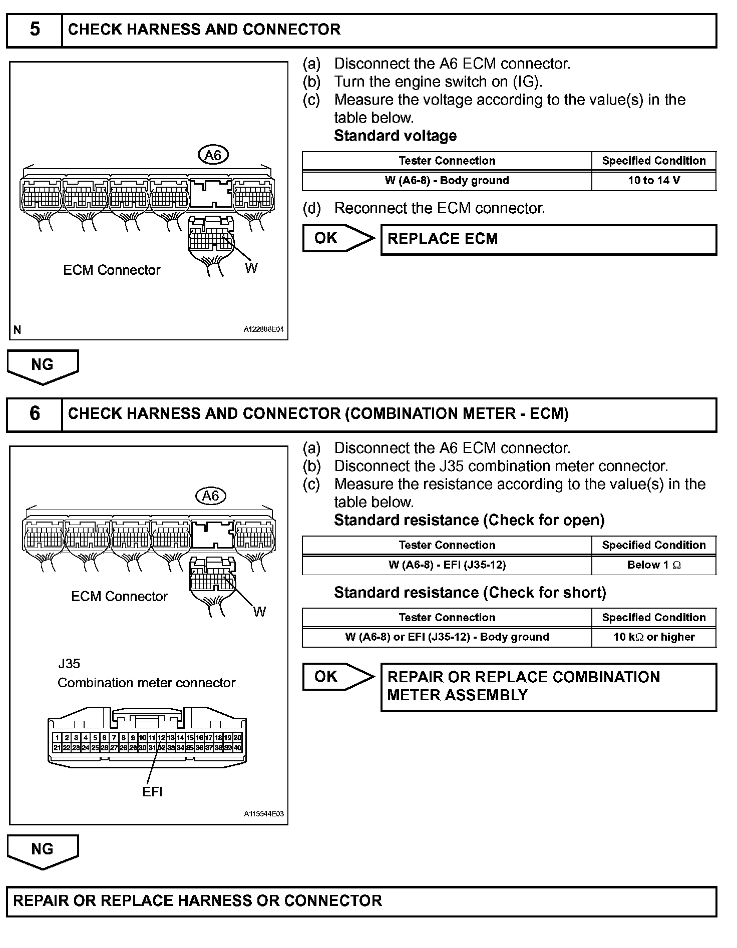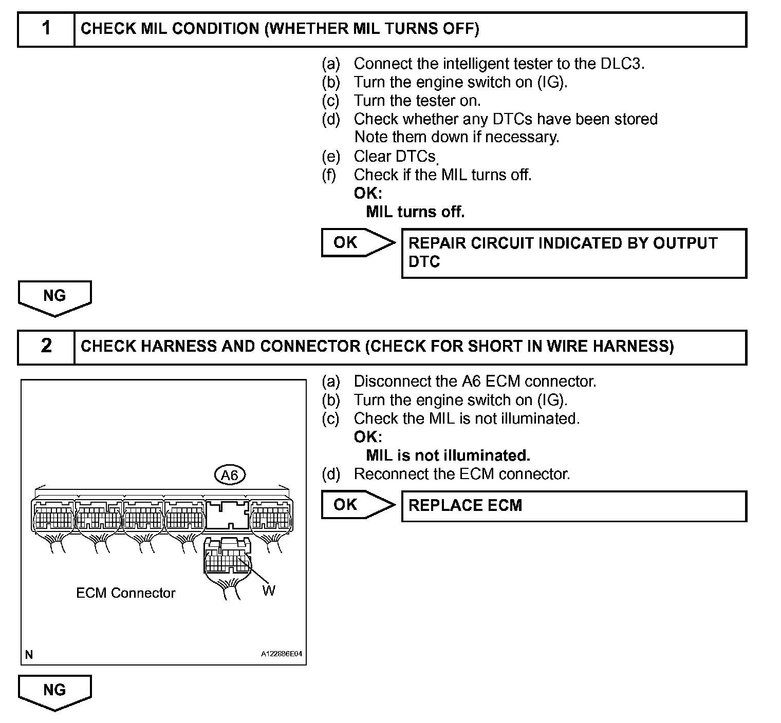 The MIL operation can be checked visually: When the engine switch is first turned on (IG), the MIL should be illuminated and should then turn off.If the MIL remains illuminated or is not illuminated, conduct the given troubleshooting procedure using the intelligent tester.
