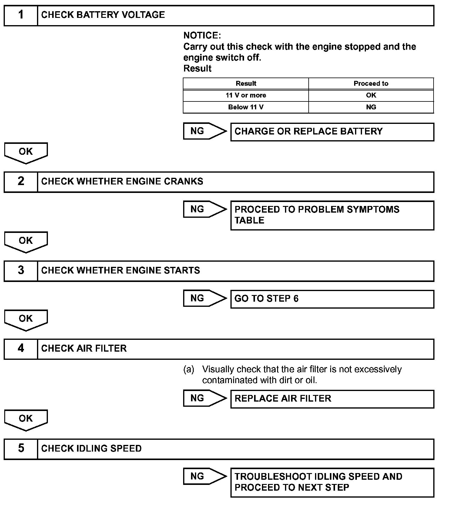 When the malfunction is not confirmed by the DTC check, troubleshooting should be carried out in all circuits considered to be possible causes of the problem. In many cases, by carrying out the basic engine check shown in the given flowchart, the location of the problem can be found quickly and efficiently. Therefore, using this check is essential when troubleshooting the engine.