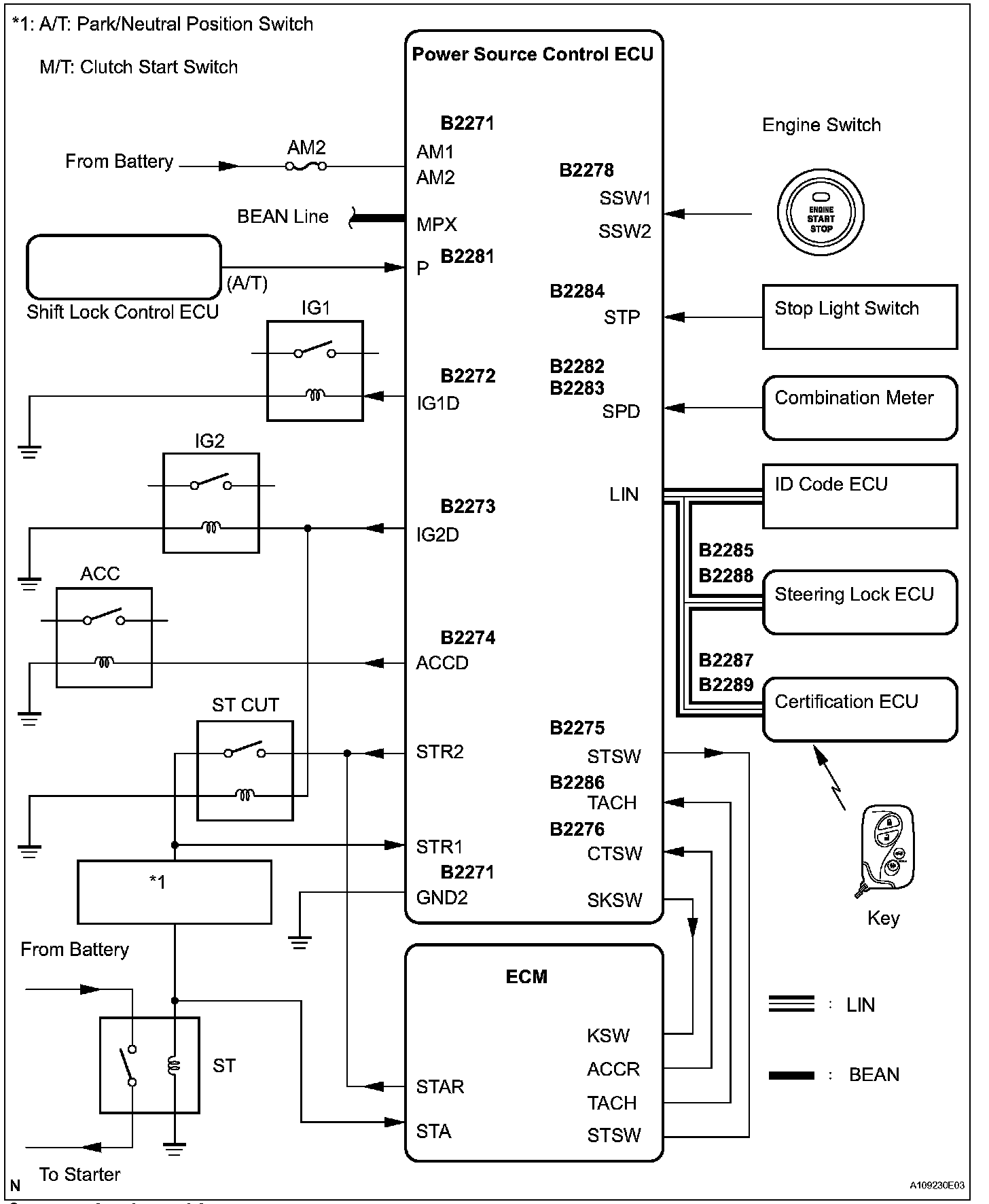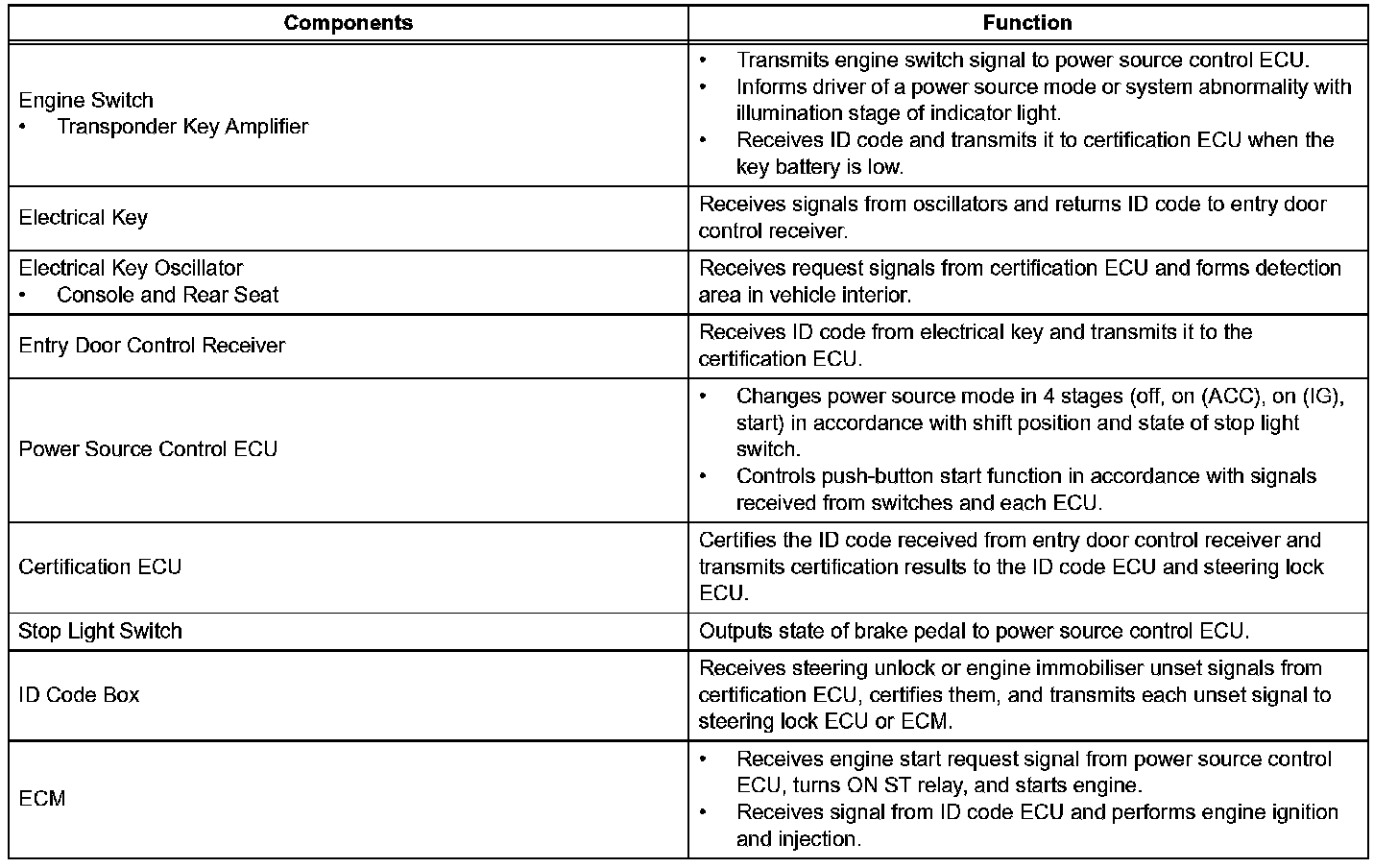 a. The push-button start uses a push-type engine switch, which the driver can operate by merely carrying the electrical key. This system consists primarily of the power source control ECU, engine switch, ID code box, steering lock ECU, electrical key, ACC relay, IG1 relay, IG2 relay and certification ECU. The power source control ECU controls the system. This function operates in cooperation with the smart access system with push-button start.