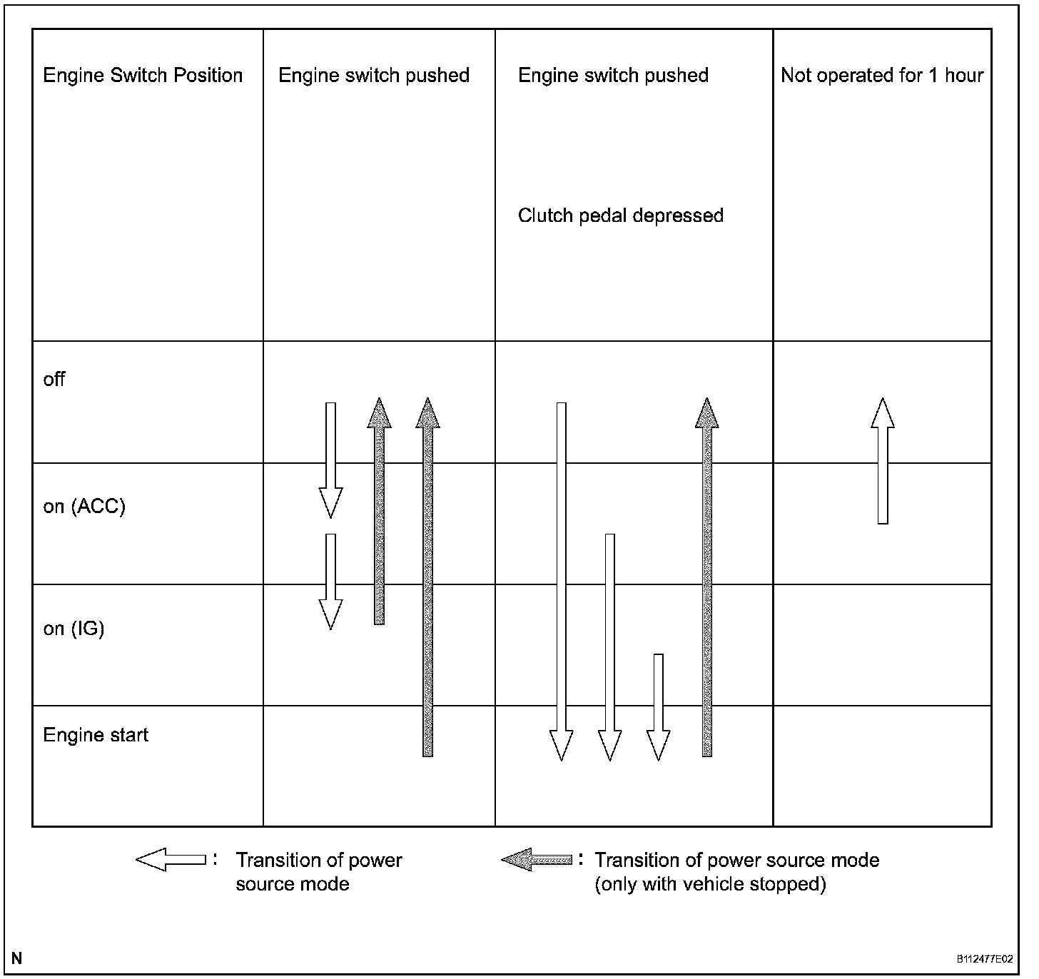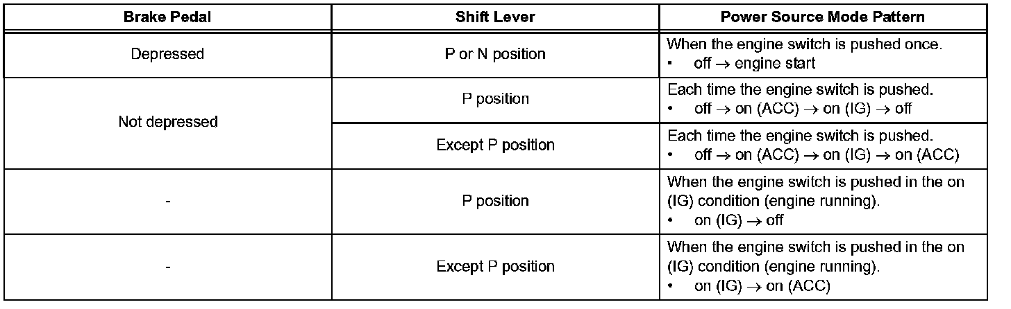 h. After the buzzer sounds, if the engine switch is pressed within 5 seconds with the brake pedal not depressed (A/T) or clutch pedal not depressed (M/ T), the power source mode changes to on (ACC) or on (IG), the same as in the normal condition.