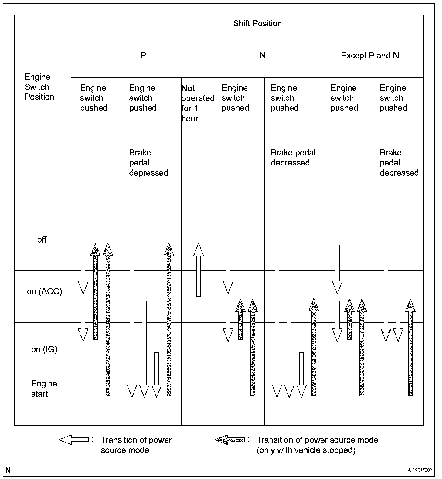 a. A/T Models: This system has different power source mode patterns depending on the brake pedal condition and shift lever position.