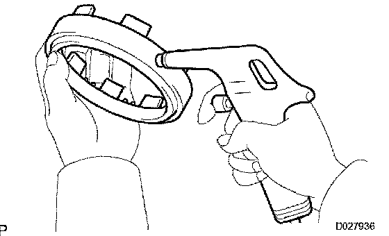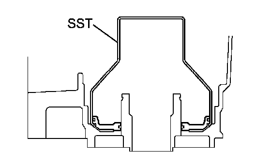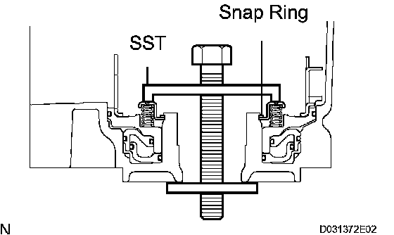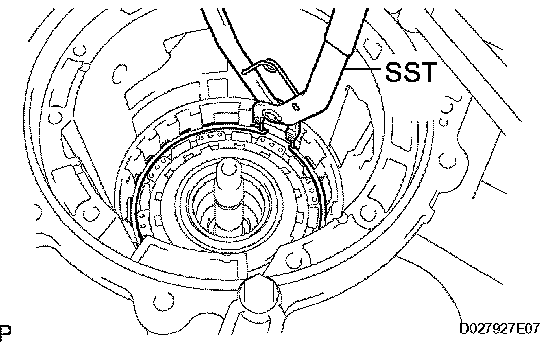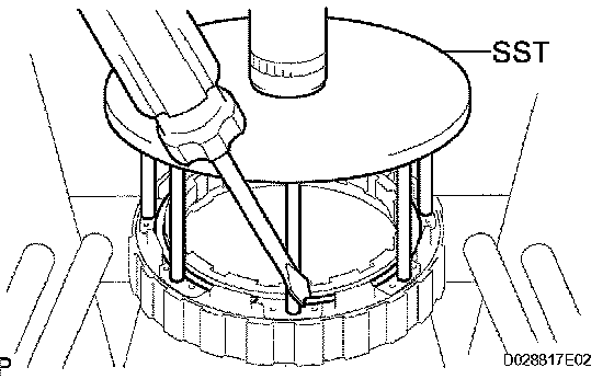a) Using SST, a screwdriver and a press, remove the 2nd brake piston snap ring.