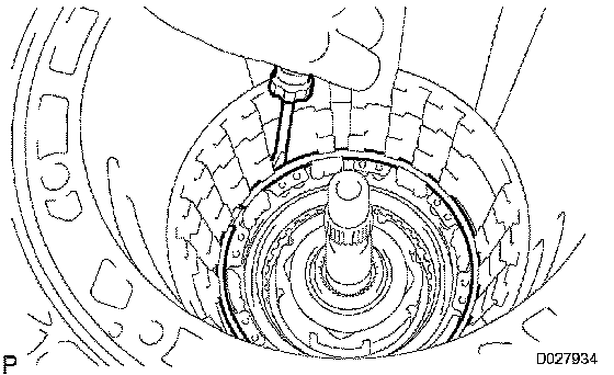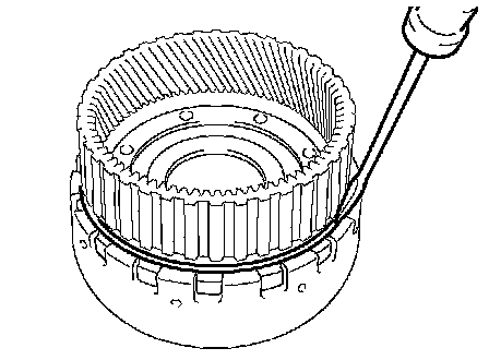 a) Using a screwdriver, remove the brake piston return spring snap ring from the transmission case.