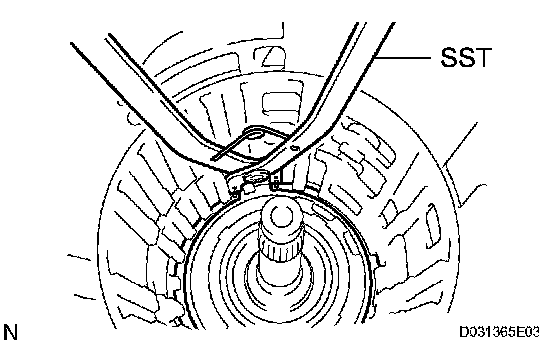 a) Place SST on the 1st and reverse brake return spring sub-assembly and compress the brake return spring.