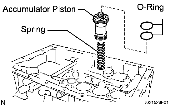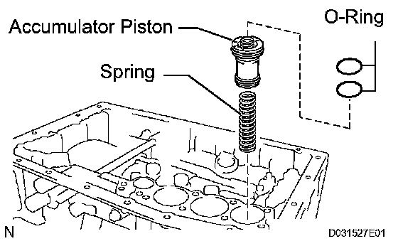 b) Install the 2 springs and the accumulator piston to the hole.