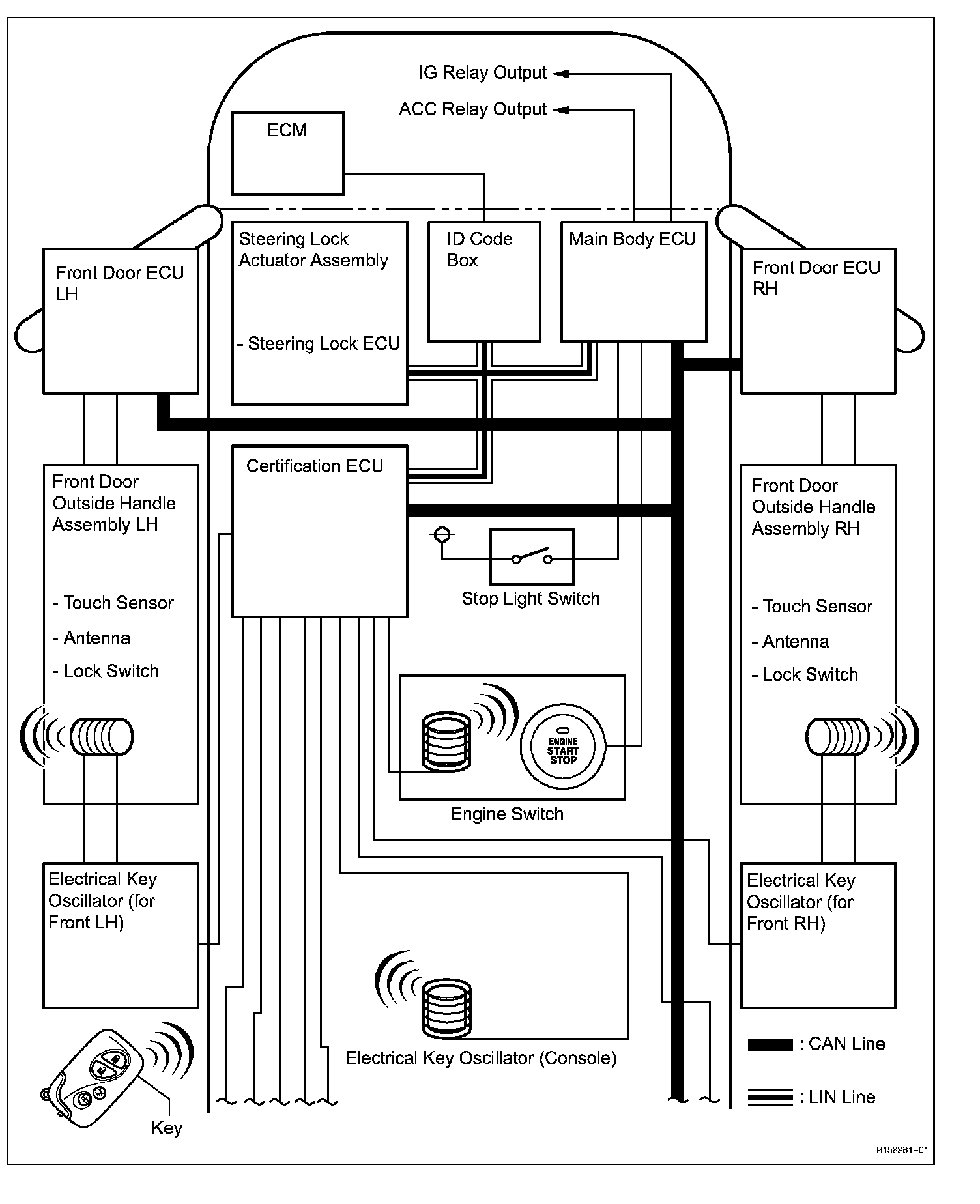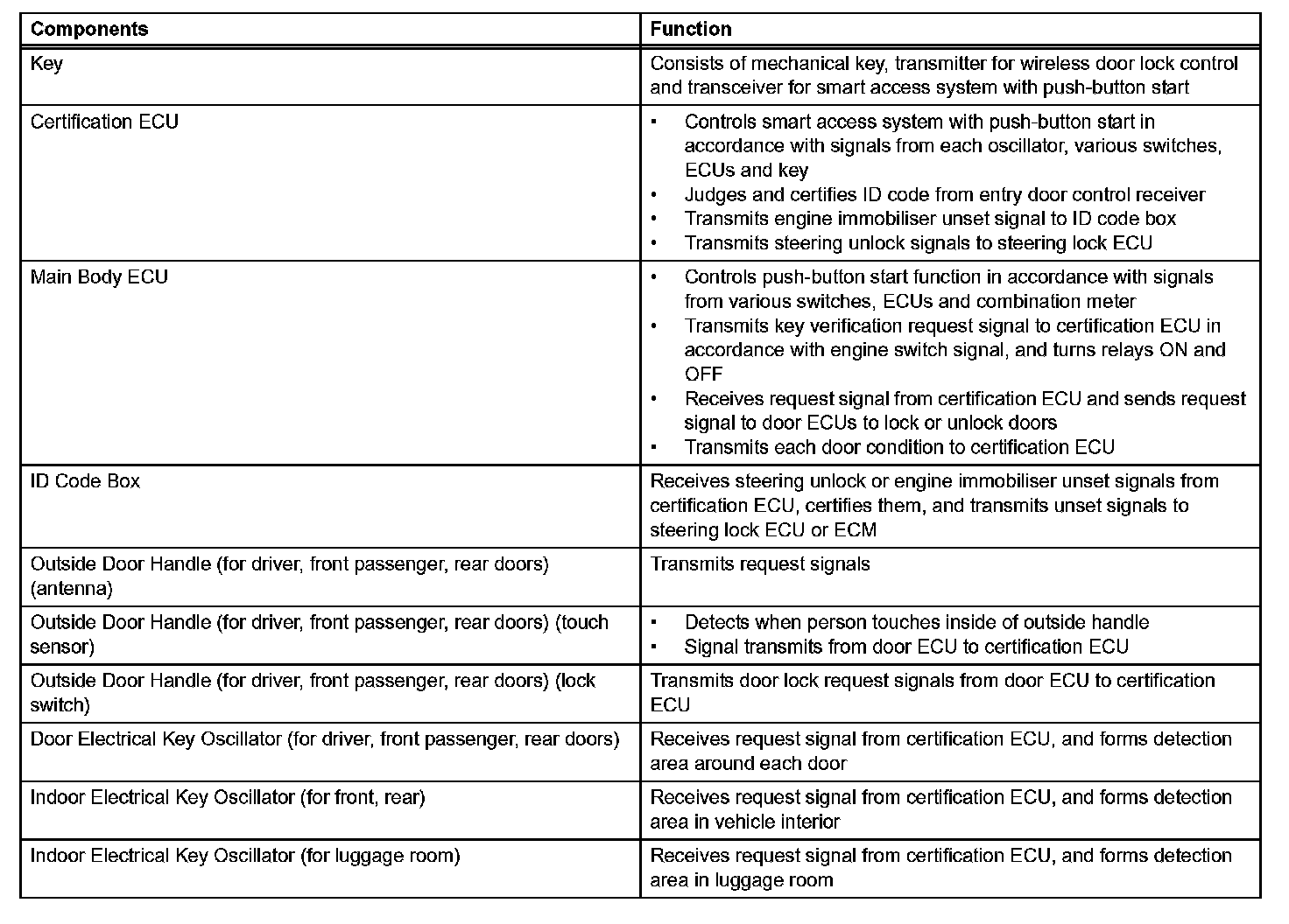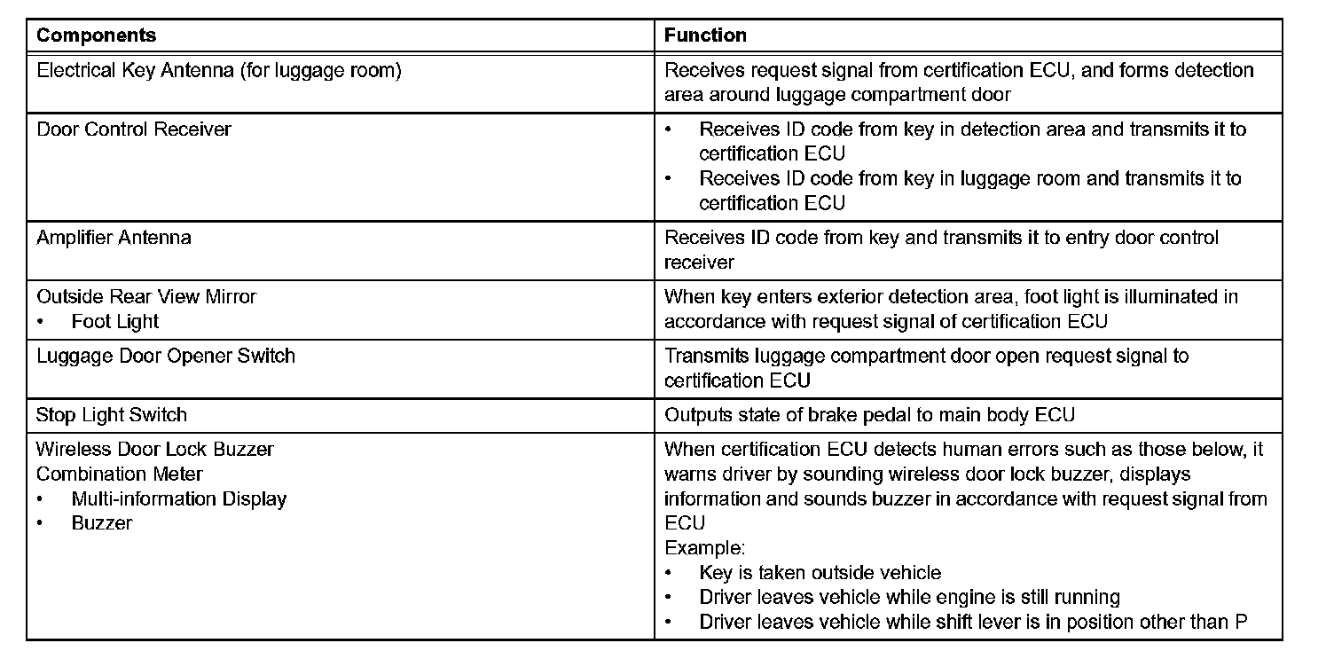 - This system is controlled by the certification ECU. When the certification ECU detects the presence of the key in one of the detection areas, it identifies and checks the ID code, and outputs operation signals to the related ECU in accordance with their functions.
