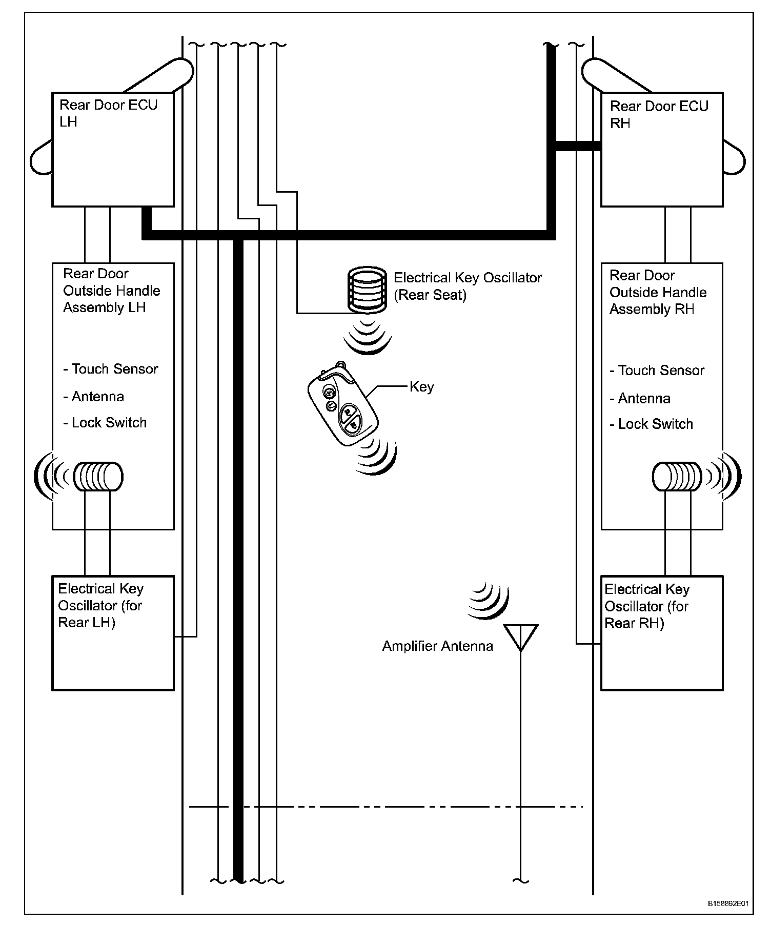 - The detection area of each door oscillator is formed by transmitting a request signal every 0.25 seconds while the engine switch is off and each door is locked. In this way, it detects the proximity of a key. During entry lock, the detection area is formed with the lock switch ON.