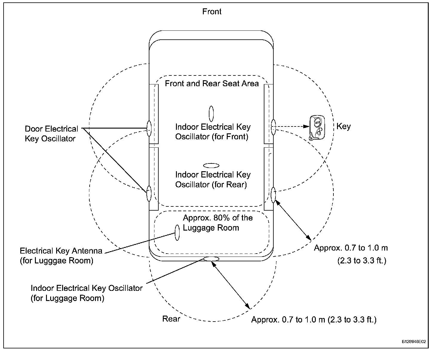 Each oscillator transmits the request signal received from the certification ECU, and forms a key detection area to detect the presence of a key. The detection area formed by each door oscillator and luggage compartment outer antenna is approximately 0.7 to 1.0 m (2.3 to 3.3 ft.) from the outside handle of each door or the center of the rear bumper.