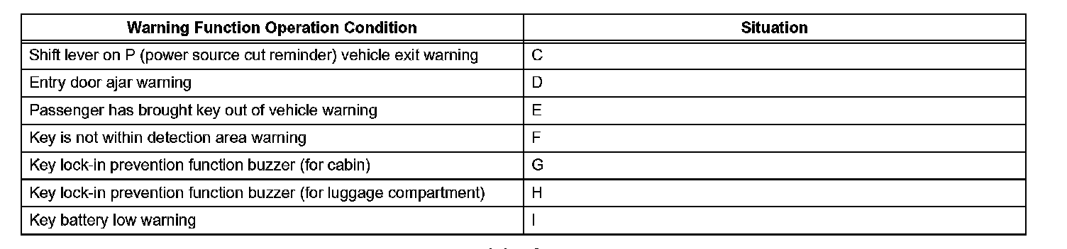 1. With shift lever in position other than P, door is opened and vehicle exit (while holding key) is attempted
