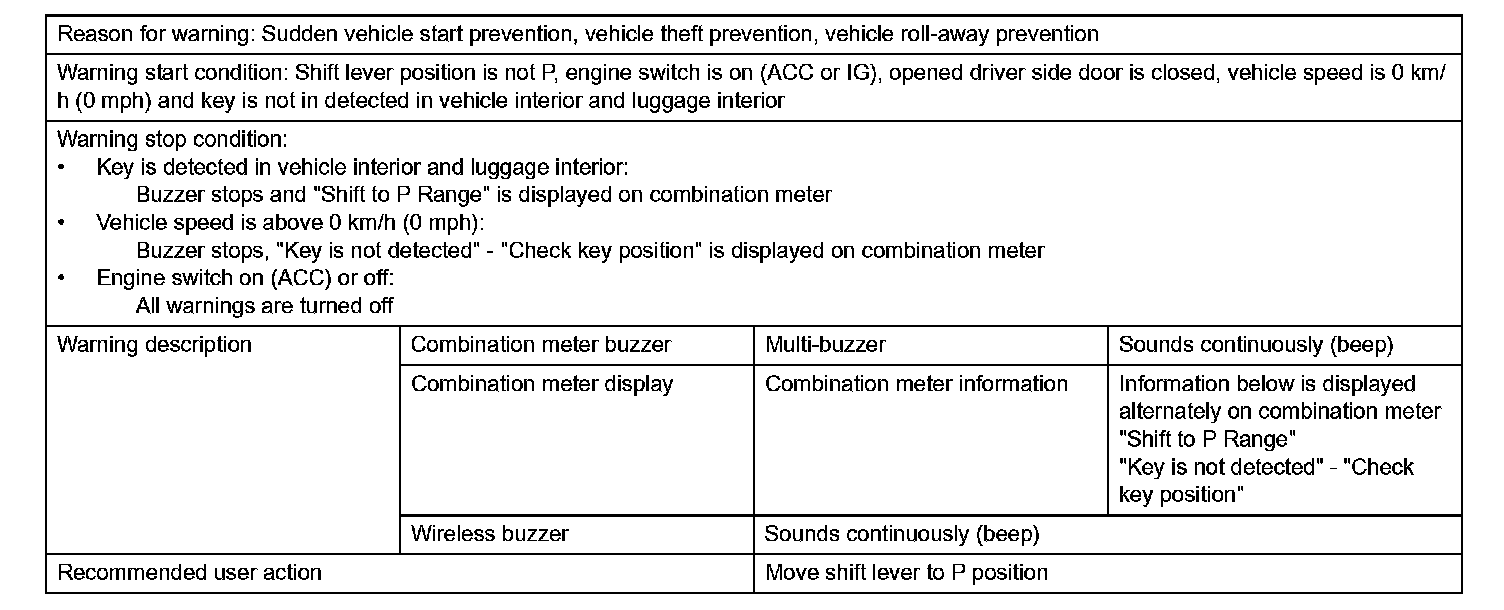 1. Pattern 1: With shift lever on P, driver door is opened, key is brought out of vehicle, driver door is closed, and movement away from vehicle is attempted
