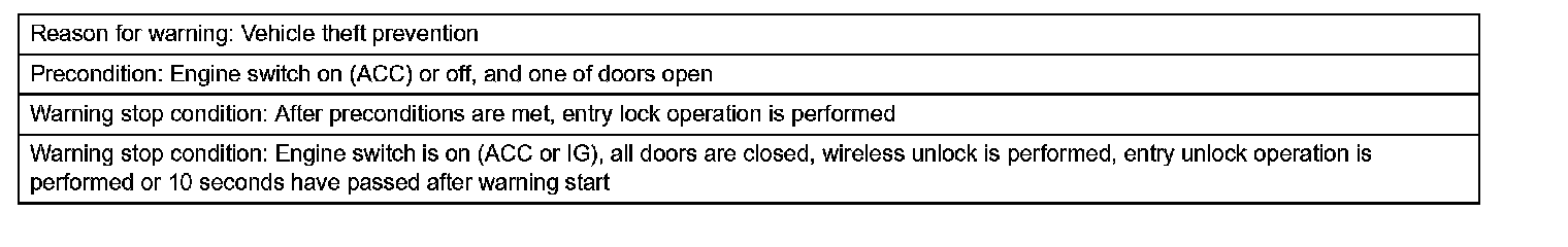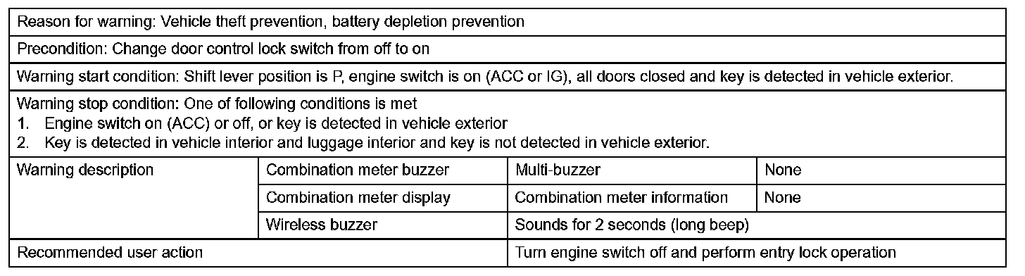 2. With shift lever on P and either engine switch on (ACC) or steering lock / unlock set, driver door is opened, move away from vehicle is performed, and door handle lock switch is pressed in an attempt to perform entry lock operation