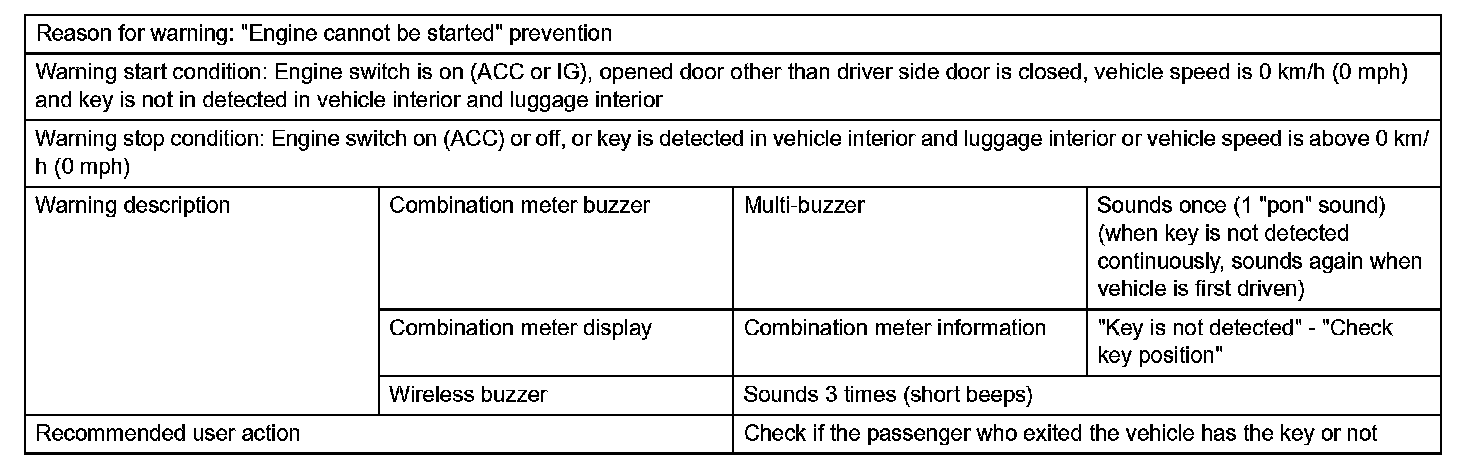 1. With engine switch in position other than off, key is brought out of vehicle by passenger