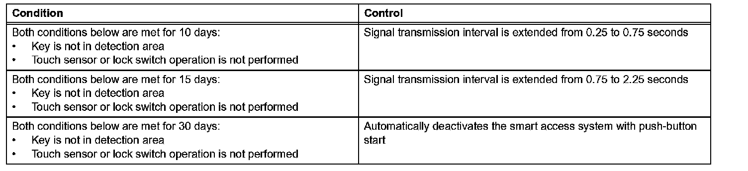 In the smart access system with push-button start, signals are emitted outside of the vehicle at a prescribed interval (0.25 seconds) when the doors are locked. Therefore, the vehicle battery could be drained if the vehicle remains parked for a long time. For this reason, the controls listed below exist.