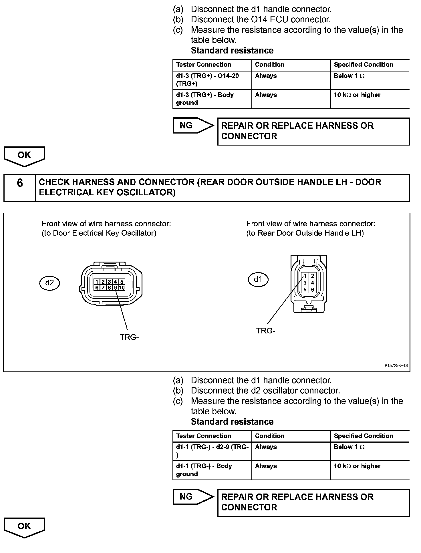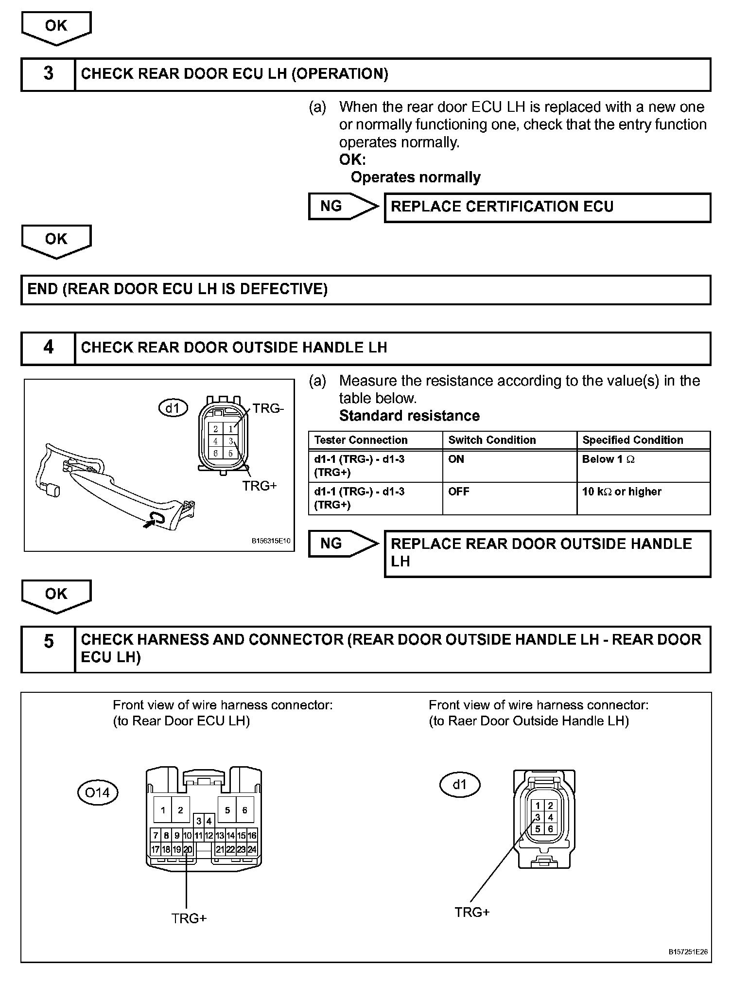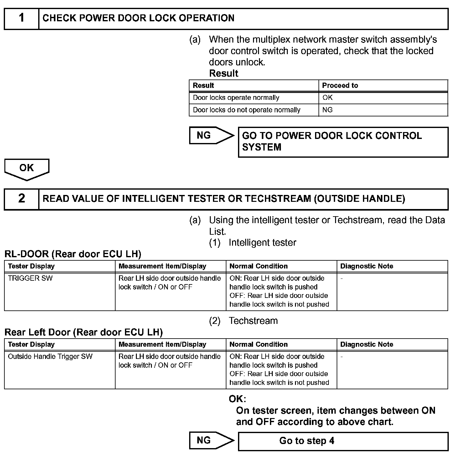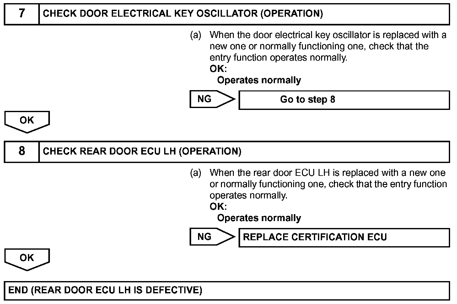 If the rear door LH entry lock function does not operate but the entry unlock operation operates, the communication line between the vehicle and electrical key transmitter is normal. Either of the following may have occurred: 1) the entry lock switch is malfunctioning; or 2) the rear door ECU LH receives the entry lock switch ON signal, but is unable to send the signal to the certification ECU through CAN communication.