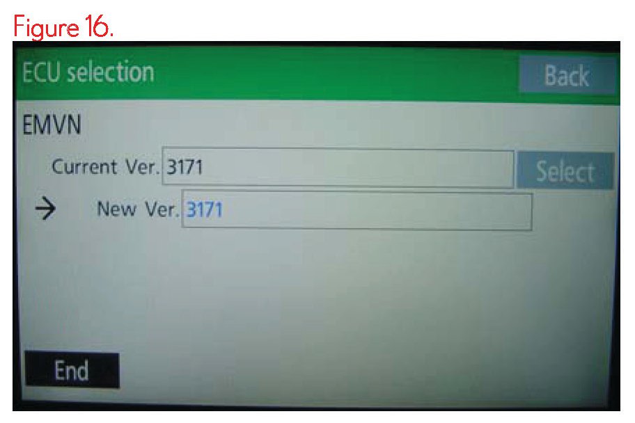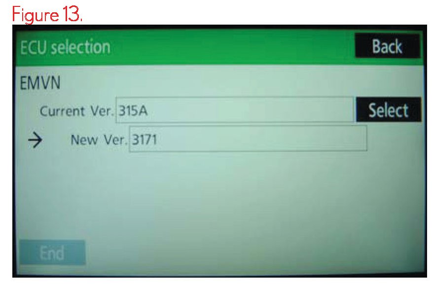 8. When ECU selection screen appears, confirm the current version is less than the NEW version. If yes then press the Select button.