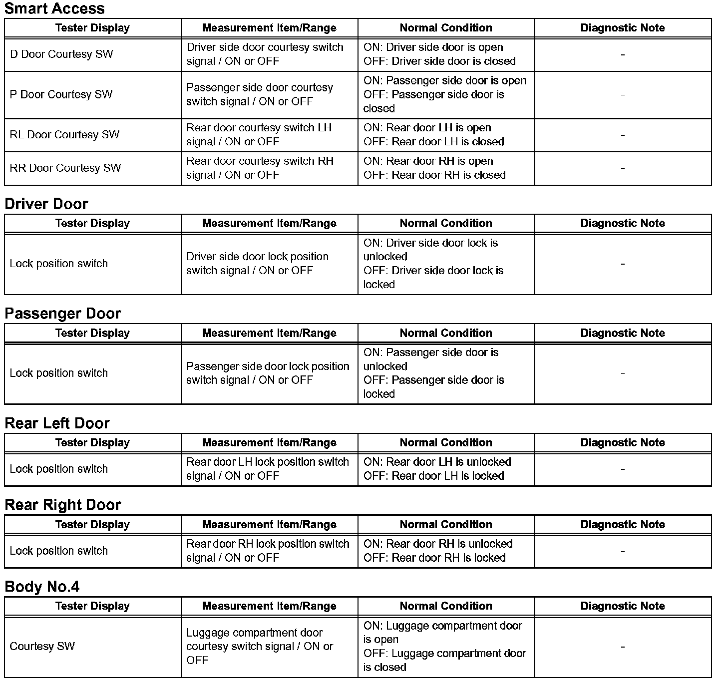 NOTE: In the table given, the values listed under "Normal Condition" are reference values. Do not depend solely on these reference values when deciding whether a part is faulty or not.