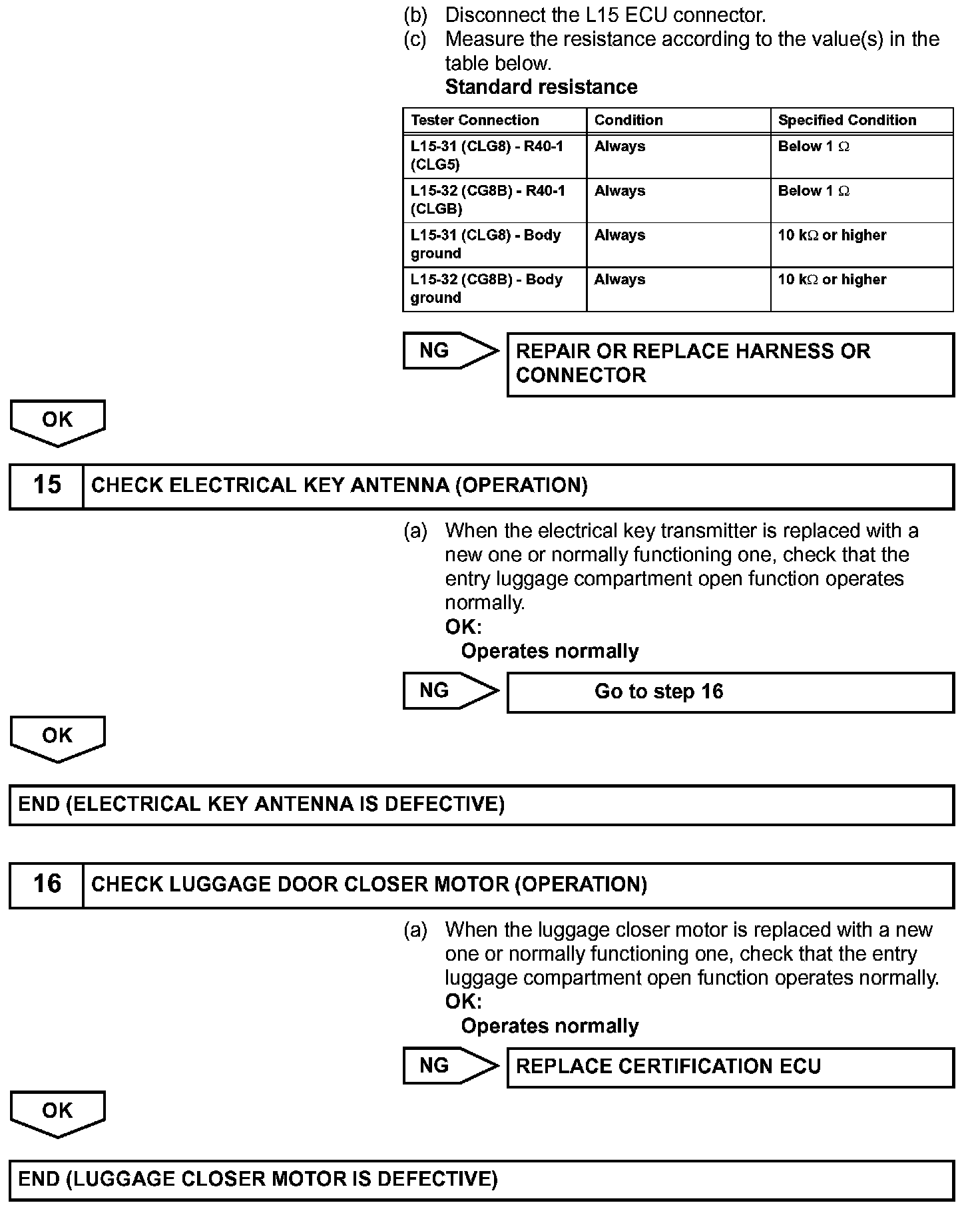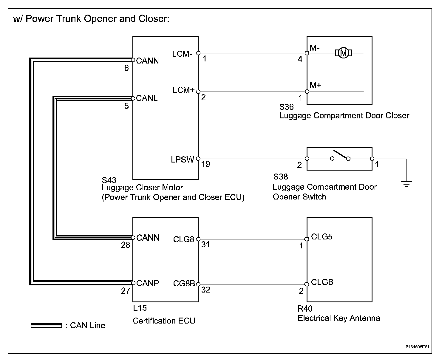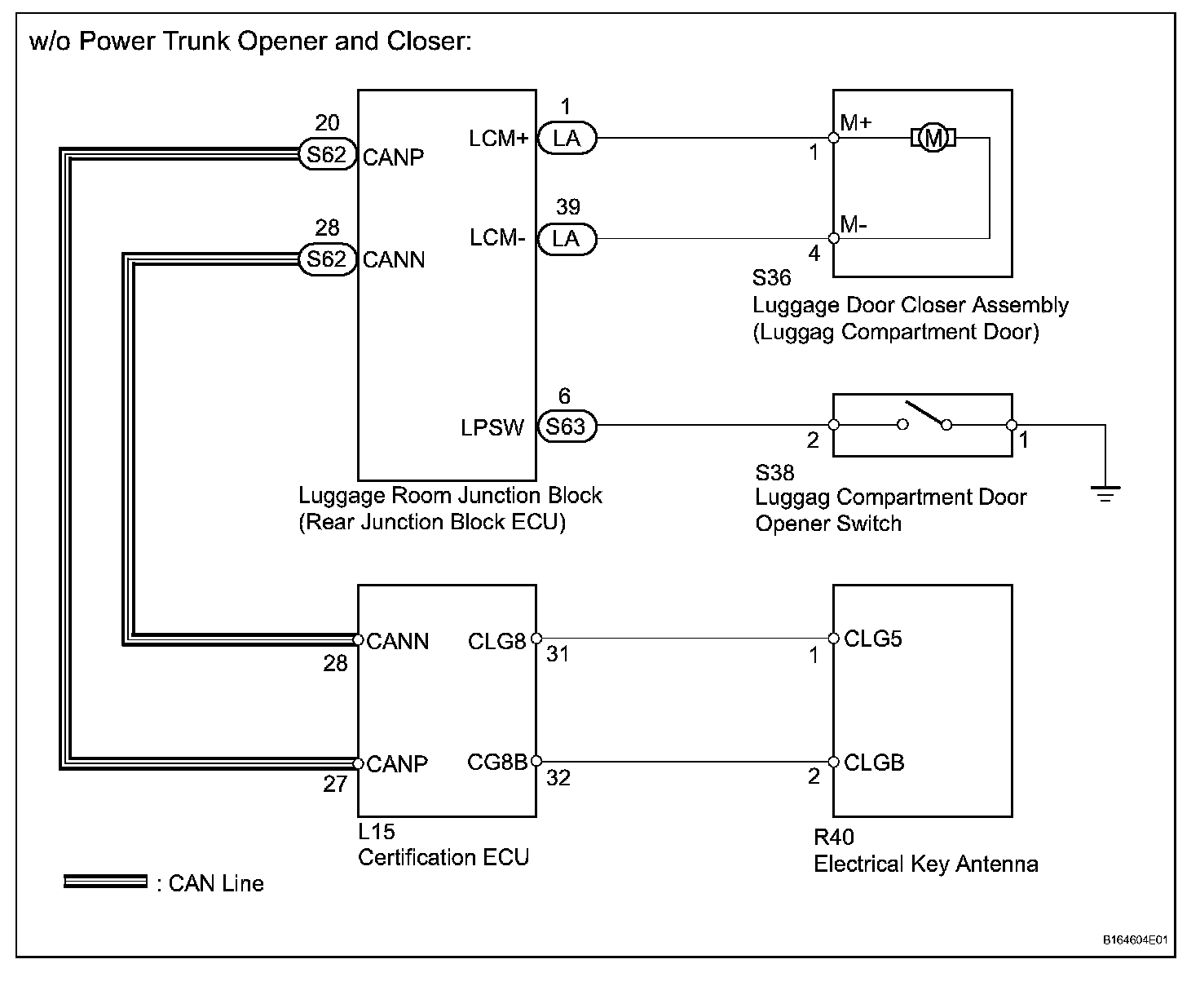 When the entry luggage compartment open function does not operate, one of the following may be the cause: 1) luggage compartment door opener switch malfunction; 2) luggage opener system (w/o power trunk opener and closer system) or power trunk opener and closer system (w/ power trunk opener and closer system) malfunction; 3) communication malfunction between electrical key antenna and electrical key transmitter; 4) the luggage junction block ECU (w/o power trunk opener and closer system) or power trunk opener and closer ECU (luggage closer motor (w/ power trunk opener and closer system)) receives the luggage compartment door opener switch ON signal, but is unable to send the signal to the certification ECU through CAN communication; or 5) certification ECU malfunction.