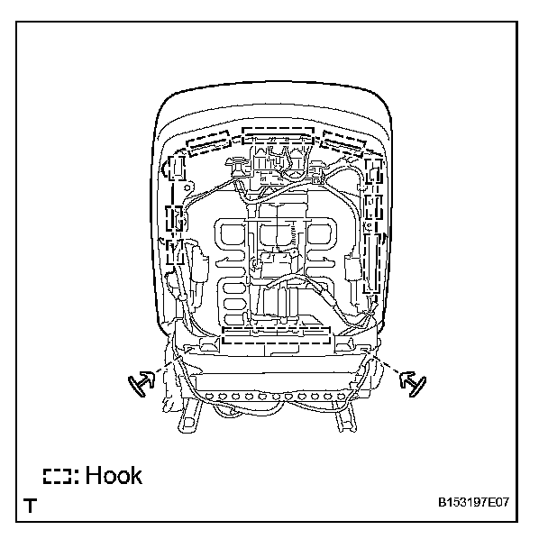 c. Using a clip remover, remove the 2 clips, and detach the hooks. Then remove the seatback cover with pad from the seat frame.