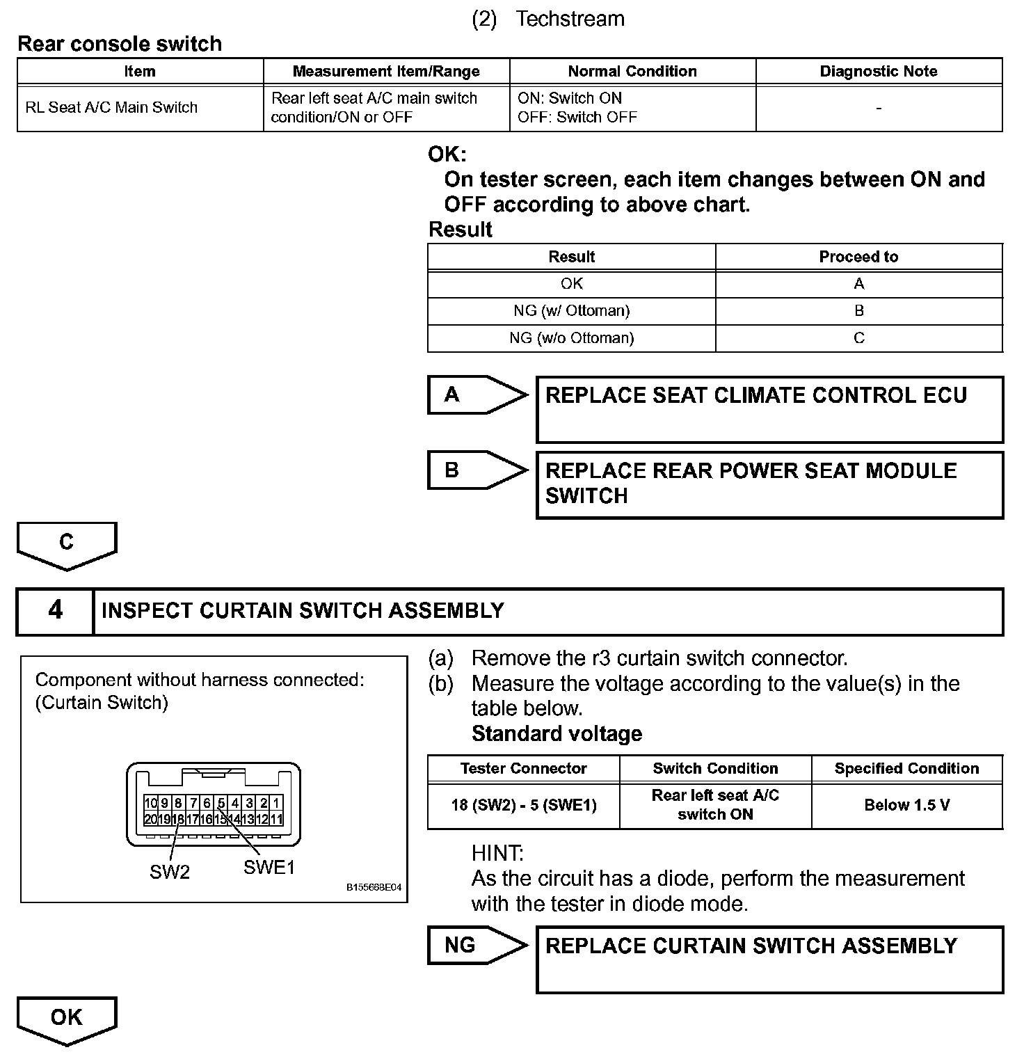 When the curtain switch assembly's* seat heater switch is operated, the rear power seat switch receives the signal. The rear power seat switch then sends the signal to the seat climate control ECU through LIN communication. The seat climate control ECU receives the signal and operates the air seat.