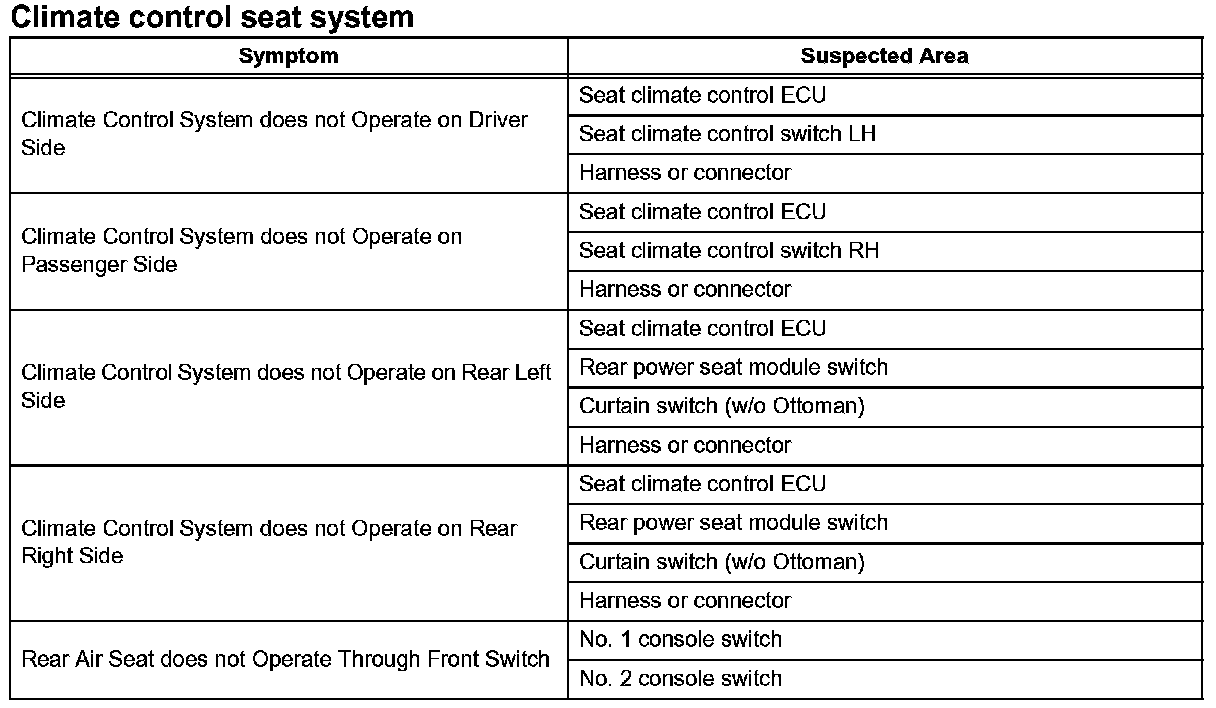 - Inspect the fuses and relays related to the system before inspecting the suspected areas below.